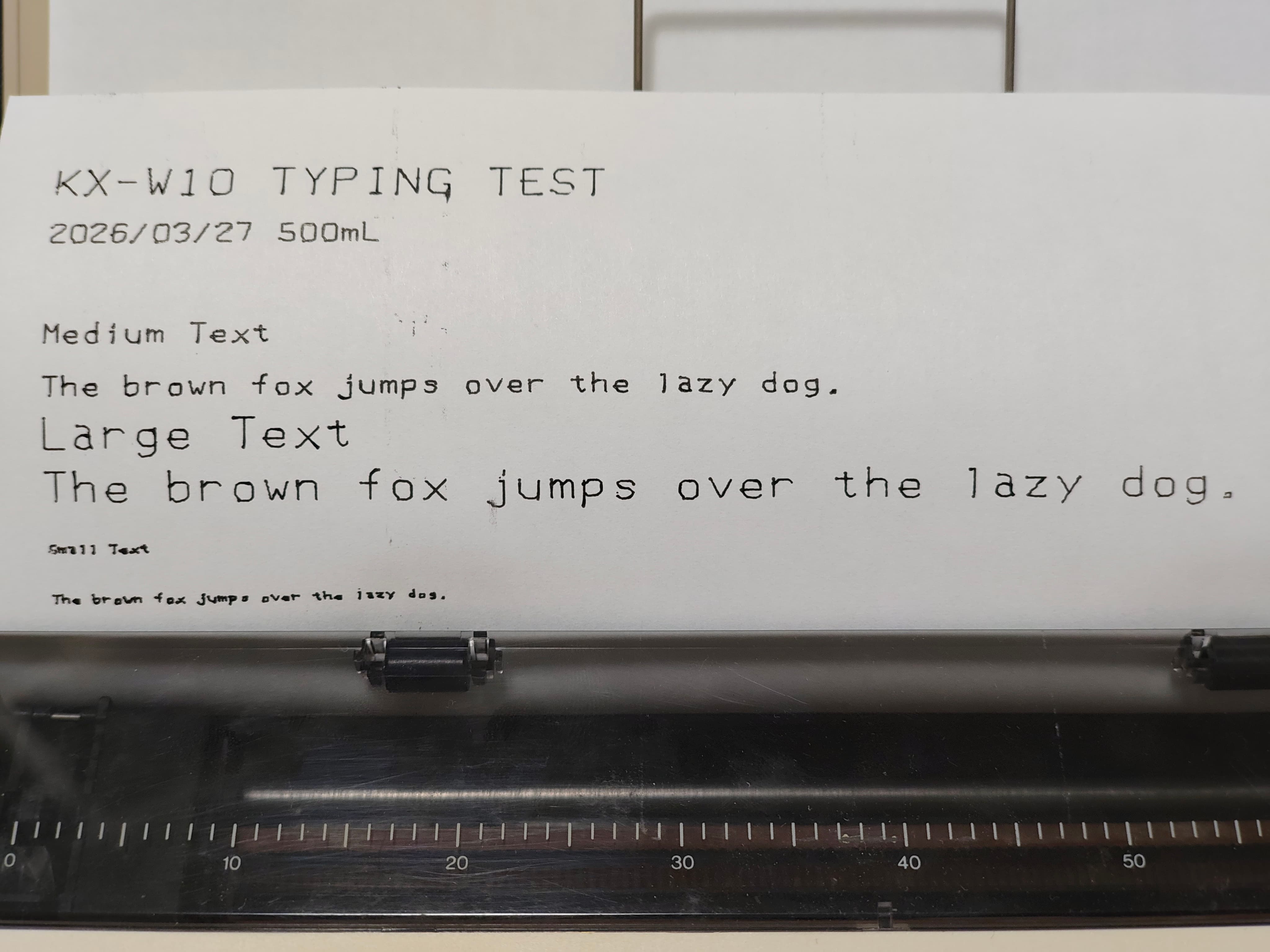 モード切替のスイッチがいくつかあって、行の間のスペース、文字サイズ、動作モード(文字ごとに印刷、行ごとに印刷、メモリ内から文章を選んで印刷)を変えられます。行ごとに印刷するモードではLCDで入力内容をチェックして修正もできるので便利です。