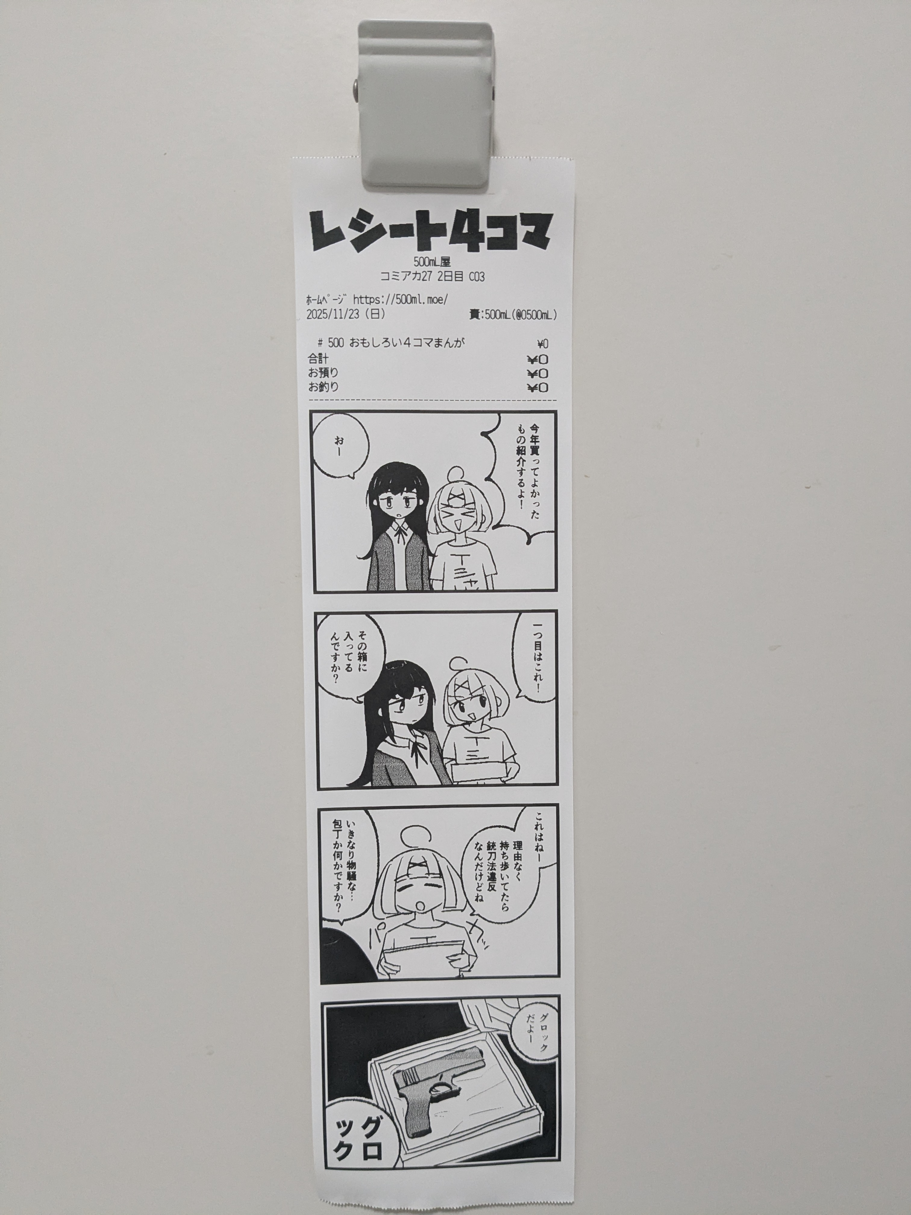 80mmのレシートに印刷されたオリジナル4コマです。レシートプリンタを中古で買ってきて印刷し、コミアカ27にて無料配布しました。